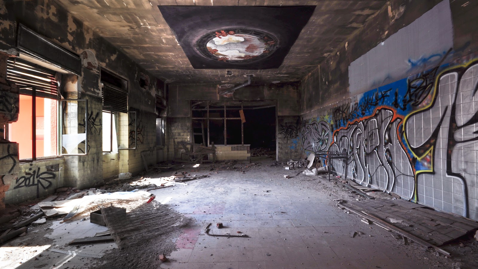 En la planta baja se encontraba lo mas característico de este hospital… Una inmensa cruz roja pintada en el techo, casi como queriendo proteger aquel bello oratorio de su destrucción total.
