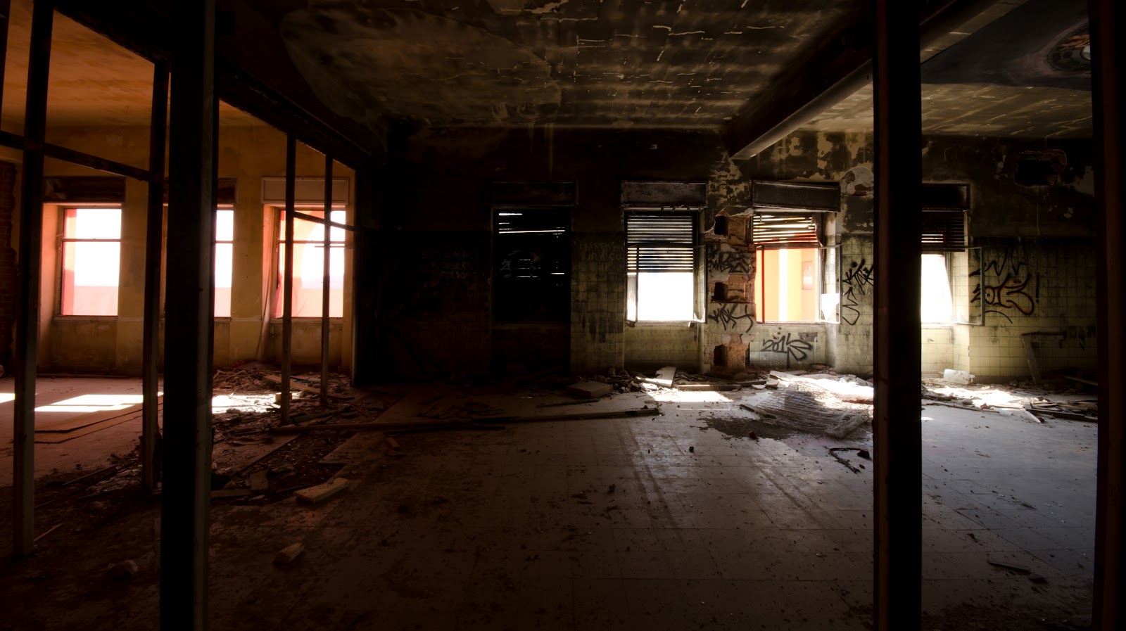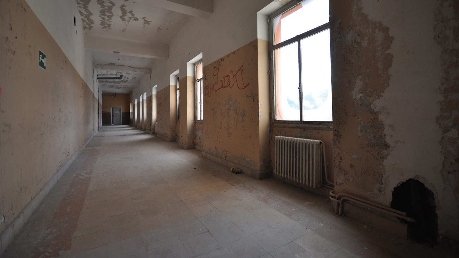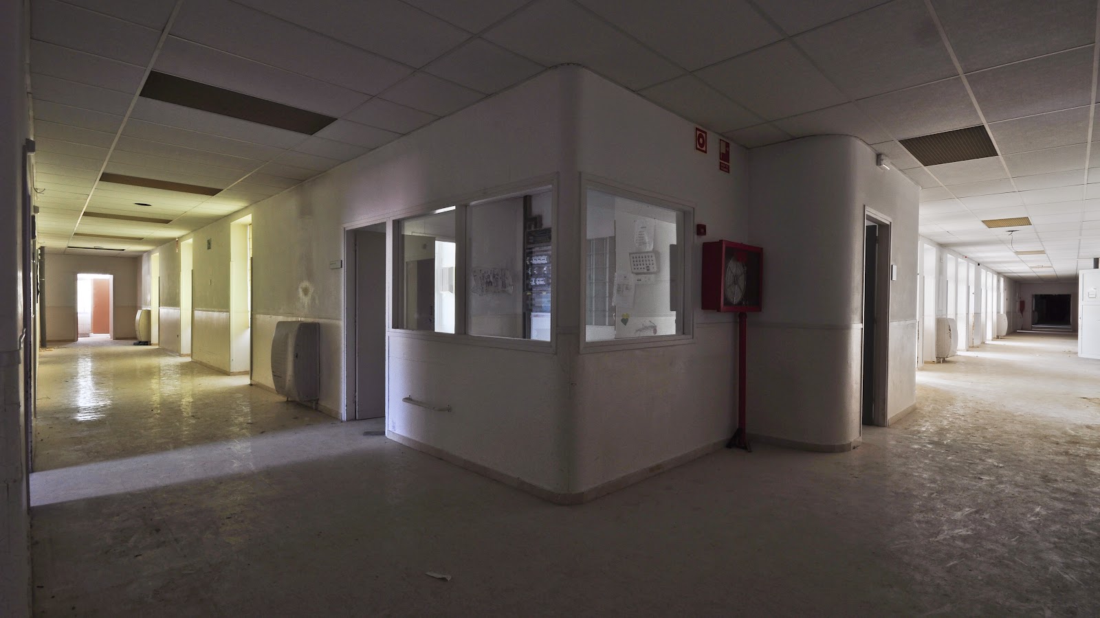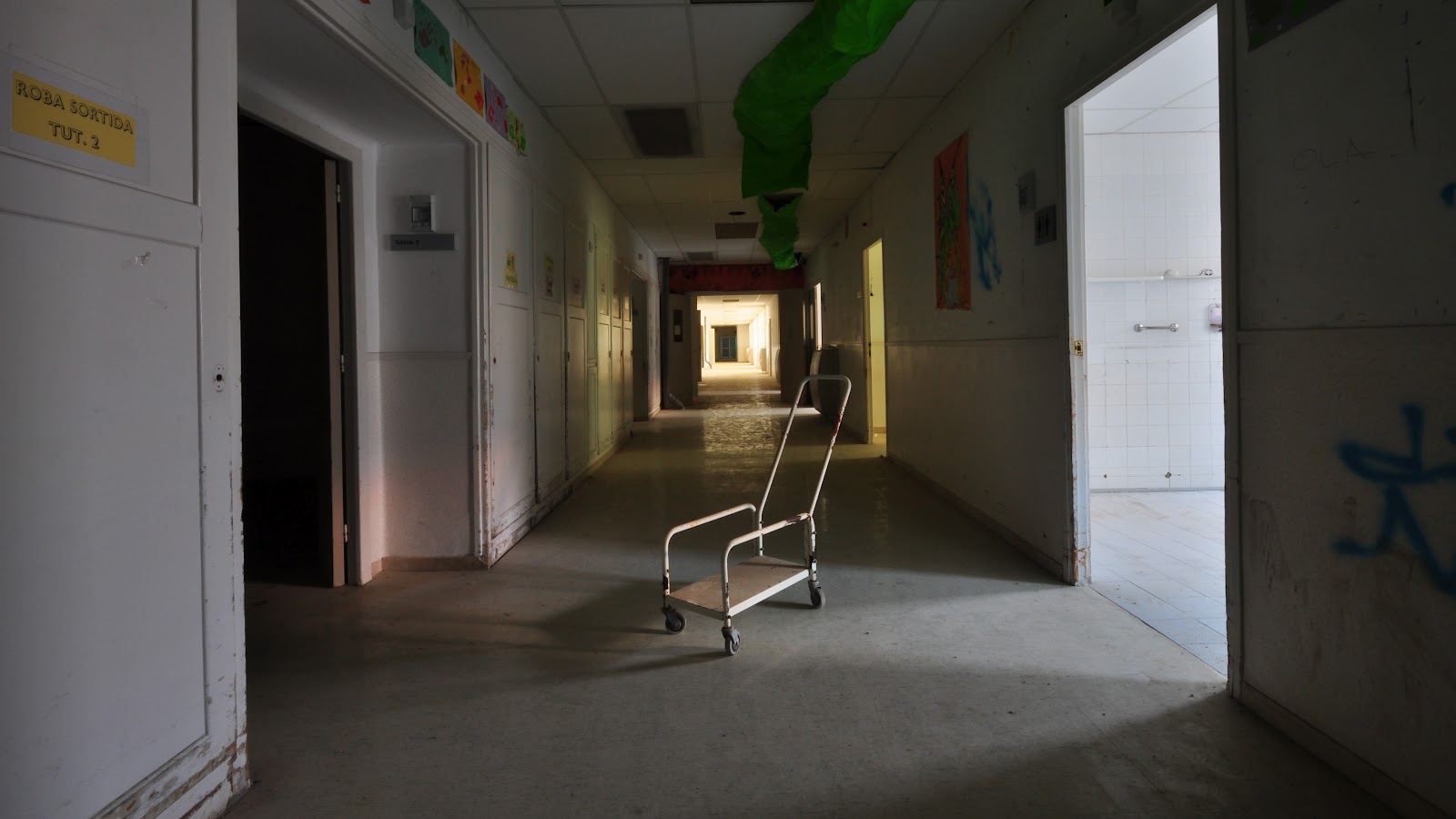 Con la cautela de no despertar antiguos fantasmas y leyendas que viven dentro de nuestro subconsciente, nos dirigimos a una de las plantas que aun siguen intactas desde su abandono, adornadas unicamente por parte del atretzzo que suelen usar los estudiantes de cine o directores que ruedan sus cortometrajes y peliculas en el hospital.