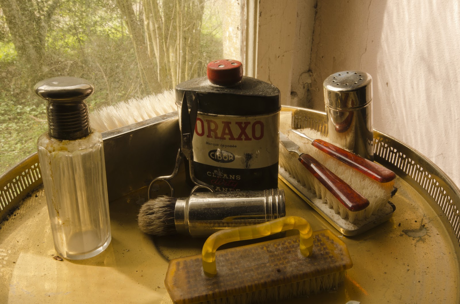 Cepillos, peines y otros enseres que daban cabida a miles de composiciones diferentes, y que nos aportaron cuantidad de ideas a la hora de mostrarlas en la web. Un frasco de metal hizo que curioseara mas tarde para tratar de encontrar que era aquella cosa llamada «Boraxo» al parecer Boraxo es una marca americana de jabón en polvo.